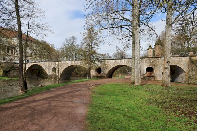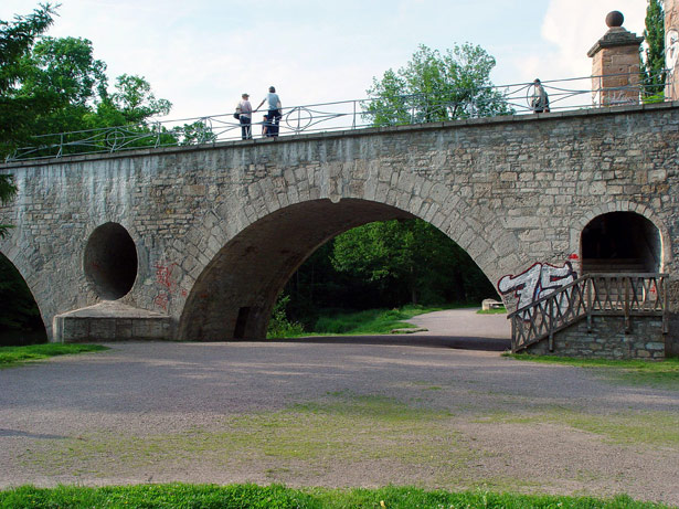 Informationen von Heidi Zengerling: Östlich des Schlosses über die Ilm in die Leibnizallee führt die steinerne Brücke, deren Name vom unmittelbar südlich gelegenen "Stern", einem ehemals frühbarocken Schloßgarten, herrührt. Früher hieß sie Schloßbrücke. Die Sternbrücke entstand beim Wiederaufbau des Schlosses durch Wilhelm IV. 1651-53 nach dem Entwurf und unter Leitung von Johann Moritz Richter. Sie ist die älteste erhaltene Brücke Weimars. Drei in den Zwickeln mit Entlastungsgewölben von 2,75 bzw. 2,20 m Durchmesser (Hochwasserdurchlässe) versehene Bögen überspannen den Fluß. Ein vierter, kleinerer Bogen wurde später an der Ostseite hinzugefügt. Er ersetzte die dort anfangs vorhandene hölzerne Zugbrücke, deren mit Kugeln bekrönte Kettenpfeiler noch auf der Brücke stehen. Das Brückengeländer schuf Clemens Wenzellaus Coudray um 1820. Ein in der Brücke zum Park hinunter führender Treppendurchgang war vermauert und wurde bei der Sanierung der Brücke 1994/95 wieder geöffnet. Kurz unterhalb der Brücke endete der gegen 1800 zugeschüttete Floßgraben. Wenig flußaufwärts an der heutigen Naturbrücke von der Ilm Mitte des 17. Jh. abgezweigt, führte er das herangeflößte Holz auf die Lagerplätze am rechten Flußufer südlich und nördlich der Sternbrücke.