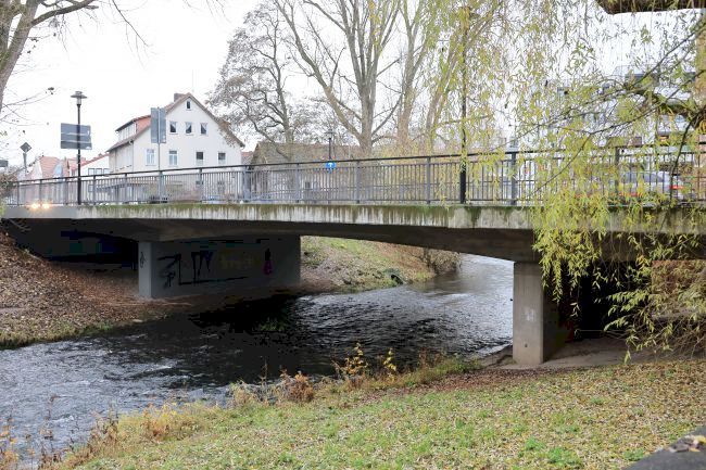 Wikipedia: Die Handelsstraße nach Thüringen nutzte im Mittelalter an der Stelle der heutigen Brücke eine Furt durch die Itz. Dort entstand in den Jahren 1401 bis 1407 zur Verehrung einer Heilig-Kreuz-Reliquie eine größere Kapelle, die spätere Heilig-Kreuz-Kirche. Zusätzlich wurde 1398 ein Holzsteg errichtet. 1465 folgte als Ersatzbauwerk die erste Steinbrücke Coburgs, die 1552 ein Hochwasser zerstörte. Der Wiederaufbau war 1555 abgeschlossen. Unter Herzog Casimir folgte 1618 der Bau einer Bogenbrücke mit vier öffnungen. Das Hochwasser mit Eisgang im Februar 1784 beschädigte die Brücke schwer. 1861 wurde die Brücke um zwei Bürgersteige verbreitert, außerdem die Montage von eisernen Geländern als Absturzsicherung durchgeführt. Wachsender Straßenverkehr ließ eine weitere Verbreiterung auf 9 Meter im Jahr 1893 folgen. 1952 wurde für die Fußgänger ein Notsteg errichtet bis schließlich die heutige Brücke im Mai 1956 dem Verkehr übergeben wurde. Es ist eine dreifeldrige Stahlbetonkonstruktion.[2] 12.000 Fahrzeuge passieren täglich das Bauwerk. Das etwa 40 Meter lange und 16 Meter breite Bauwerk weist drei Fahrstreifen und beidseitig Gehwege auf.[4]
