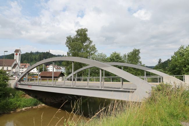 Bogenbrücke, Bogen über der Fahrbahn, Stabbogenbrücke