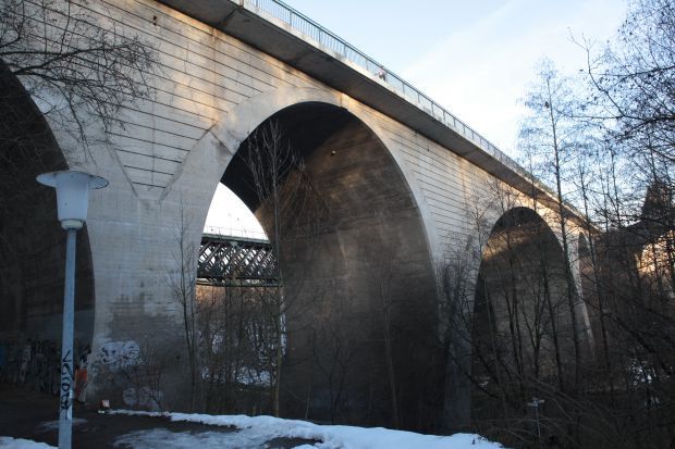 1904-1906 als viergleisige Eisenbahnbrücke gebaut. 1965-1969 wurde der Kopfbahnhof durch einen Durchgangsbahnhof ersetzt und die Brücke für den Eisenbahnverkehr überflüssig. Sie wurde von der Stadt übernommen und als Strassenbrücke umgebaut.