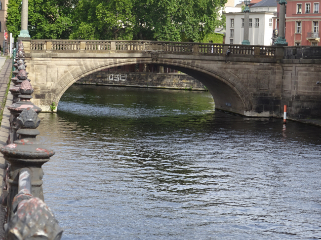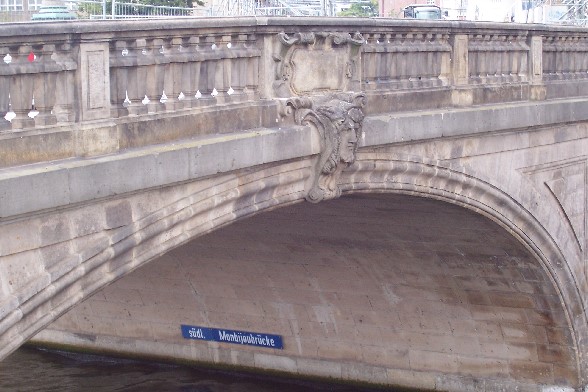 Mitte (Dorotheenstadt/Spandauer Vorstadt), verbindet die Straße Am Kupfergraben mit der Monbijoustraße an der Stelle, an der die Spree und der Kupfergraben wieder eins werden. 1776 wurde eine hölzerne Jochbrücke gebaut, die den Namen Kleine Weidendammer Brücke, später Mehlbrücke trug. An deren Stelle trat die 1903/04 von Ernst von Ihne errichtete M., benannt nach Park und Schloß Monbijou. Die Brücke besteht aus zwei Teilen. Durch den einen wird der Kupfergraben und durch den anderen die Spree überspannt. Der Scheitelpunkt der Brücke liegt vor dem Haupteingang des Bodemuseums. An der Spreeseite beträgt die Breite der Brücke 14 m, am Kupfergraben 15 m. Im II. Weltkrieg wurde der spreeüberspannende Brückenteil von deutschen Truppen gesprengt, 1950 provisorisch wiederhergerichtet. 1968 ist der südlich den Kupfergraben überspannende Brückenteil, der im zweiten Weltkrieg unbeschädigt blieb, rekonstruiert worden. Die Brücke steht unter Denkmalschutz. (Infos von www.luise-berlin.de)