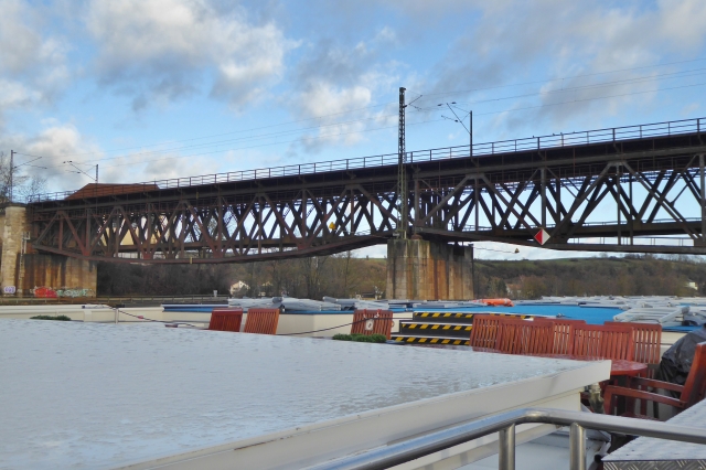 Fachwerkbrücke 3 Felder unter der Bahnlinie im Flußbereich, im Vorlandbereich eine Kette von Segmentbögen unter der Bahnanlage