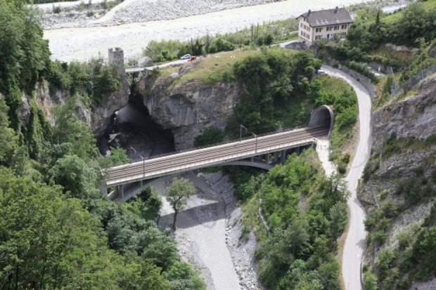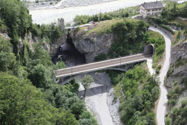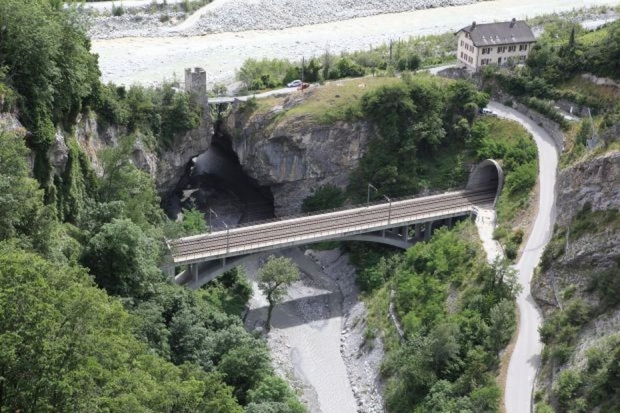 Strecke: Brig - Sion - Lausanne. Die Brücke befindet sich auf der neuen 2-spurigen Linienführung zwischen Leuk und Salgesch. (Früher war zwischen diesen beiden Ortschaften nur eine einspurige Linie.