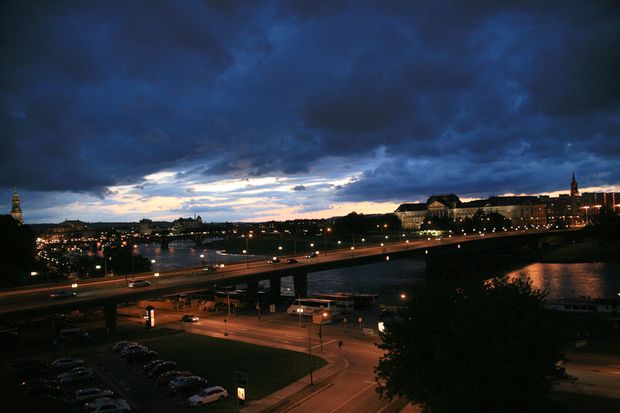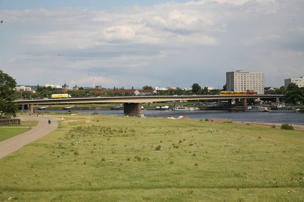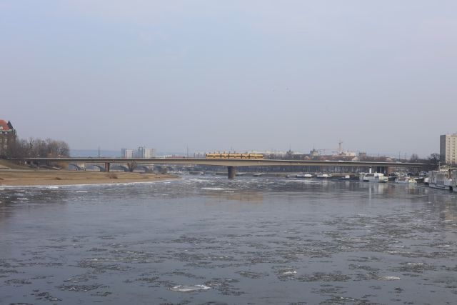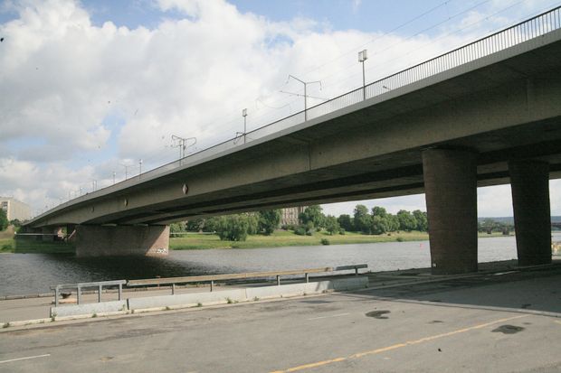 Diese Brücke wurde in der Bombennacht am 13./14. Februar zerstört. Nach dem Krieg wurde die heutige Stahlbetonbrücke errichtet.