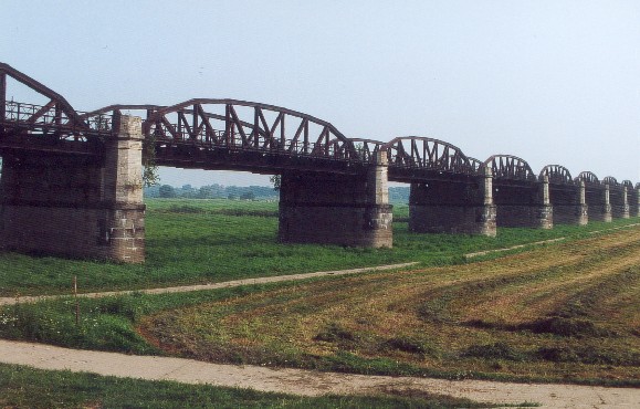 Informationen von Thomas Gaumert: ursprünglich zweigleisig angelegt, später Rückbau auf eingleisigen Betrieb; die ursprüngliche Drehbrücke zwischen den Brückenjochen am Ostufer wurde bis 1912 benutzt und 1922 schließlich fest verankert. Zerstörung am 20. April 1945 gegen 16:00 Uhr durch 2 alliierte Bomber, die aus einer 6er-Formation ausscherten. Bergung der Trümmer aus dem Fluss 1948.