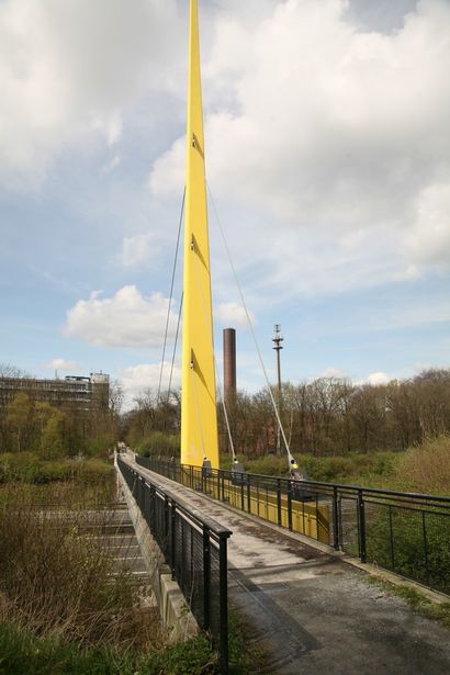 erster Einsatz war beim deutschen Pavillion auf der Weltausstellung 1958 in Brüssel, anschließend diente sie mehrere Jahrzehnte als Verbindungsbrücke zwischen den beiden Zoohälften des Duisburger Zoos über die Autobahn A3, 1998 wurde sie demontiert und für einige Monate im Autobahnkreuz Duisburg -Kaiserberg zwischengelagert bis sie ein paar hundert Meter südlich des Zoos wieder aufgebaut wurde. Aufgrund der breiteren Autobahn wurde am westlichen Widrlager ein kleiner Kragarm als Verlängerung eingebaut. Die Brücke besteht aus einem Torsionsversteifungsträger der an den Seilen hängt, und einem seitlich angebrachten Fußweg.