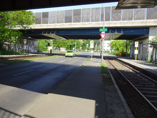 Ottomar Geschke Strasse Fahrbahn mittig und 2 Straßenbahngleise jeweils außen zwischen Fahr und Gehbahn