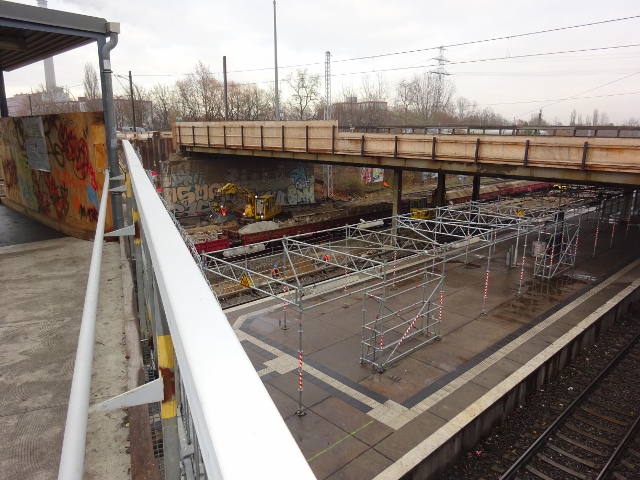 Nachsatz aus der Bauzeit der Brücke . Die Brücke wurde vor Ort gebaut. Hierzu mußte ein Teil der Parzellen in der Kleingartenanlage der Deutschen Reichsbahn nordwestlich der Brücke abgerissen werden um Platz zu machen für den Aufbau eines Derricks. Mit diesem fest verankerten Derrick war man begrenzt im Teilkreisbereich des Auslegers in der Lage die Einzelteile zur Brücke zusammen zu fügen. Die Rhinstraße aber gab es noch nicht und an ihrer Stelle wuchs die Brücke Stück für Stück und überbau für überbau heran. Für die überführung über die Bahntrasse war der Bahnverkehr gesperrt worden und es wurde einer von in der DDR vorhandenen 2 Krane mit 400 MP Tragkraft im Bereich der Deutschen Reichsbahn bereit gestellt für die Teileüberführung . Alles passierte von der Nordseite aus, weil auf der Südseite neben der Trasse das S Bahngleis Stadtauswärts verschwenkt verlief das hinter dem gebauten Widerlager der Brücke in Betrieb war während der gesamten Bauzeit.