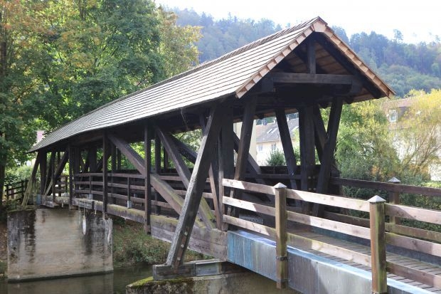 Covered Bridge, gedeckte Holzbrücke, Fachwerkbrücke (Multiple queenpost, Hängewerk)