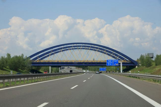Bogenbrücke, Bogen über der Fahrbahn, Stabbogenbrücke