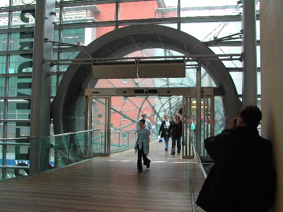 entworfen von Hoddeo Associates, Die Brücke wirkt wie ein liegender Kühlturm, durch den man hindurchgehen kann.