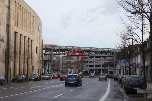 oben im Fachwerkträger fahren Autos vom Parkhaus zum Parkdeck, unten an einer abgehängten Fahrbahn ist der Fußgängerverkehr zwischen Parkhaus und Einkaufscentrum angesiedelt