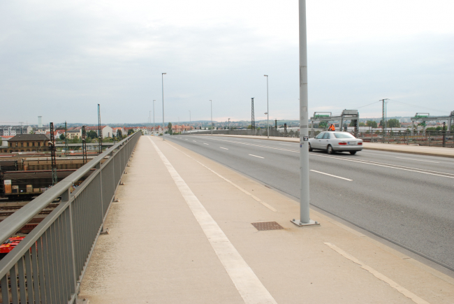 Blick von Osten auf den nördlichen Teil der Brücke mit Treppenabgang zum Haltepunkt Dresden-Friedrichstadt