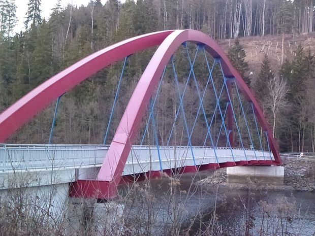 Stabsegmenbogenbrücke über der Fahrbahn, 1 Feld, 2 Überbauten zueinandergeneigt und zusammengefügt