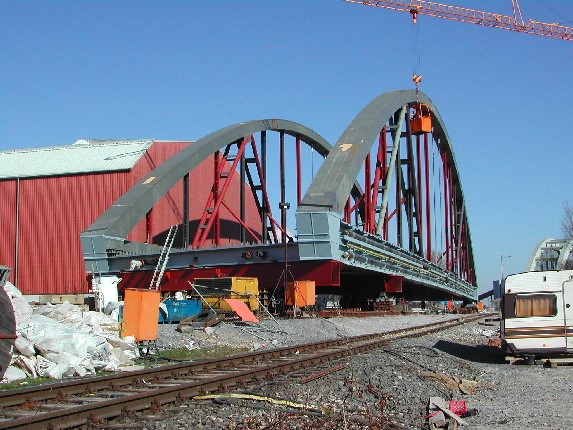 Bogenbrücke, Bogen über der Fahrbahn, Stabbogenbrücke