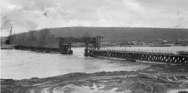 die Brücke mit Hubfeld in der Mitte während eines Hochwassers im November/Dezember 1944