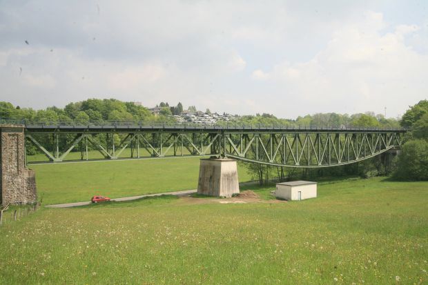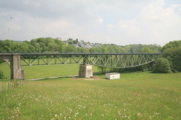 ``Die Bahnbrücke liegt östlich von Meinerzhagen im Verlauf der eingleisigen DB-Nebenbahnstrecke Meinerzhagen-Krummenerl. Sie wurde in den Jahren 1912 - 1914 erbaut. Das charakteristische Merkmal der Brücke ist das Stahlfachwerk, das auf zwei Teilstrecken aus gradlinigen überbauten und dazwischen angeordnet aus einem nach unten gerichteten Fischbauchträger besteht. Ergänzt wird das Stahlfachwerk durch eine nach Westen anschließende Massivbogenbrücke, bestehend aus 2 Brückenbögen mit Betonkern und Bruchsteinverkleidung. Brücken mit solchen Tragwerken sind in der Bundesrepublik Deutschland nur in geringer Zahl vorhanden. Die Brücke ist als technisches Baudenkmal geschützt.``