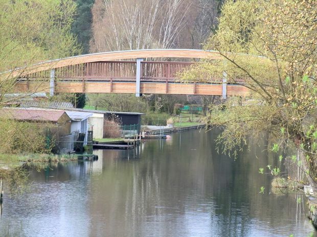 Stabsegmentbogenbrücke über der Nutzfläche. Der Bogen aus geleimten Holzbindern mit Abhängung der Stäbe über dem Flußbereich aus Stahlträgern. Die Vorlandfelder sind Balkenbrückenelemente