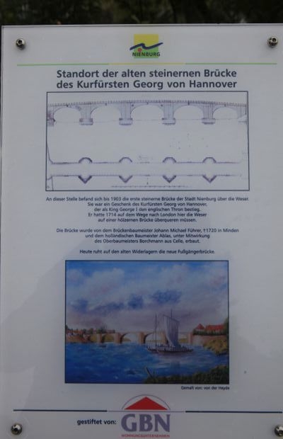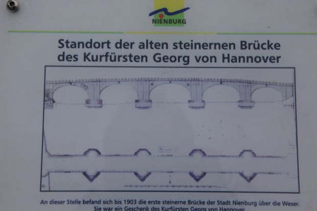 An dieser Stelle befand sich bis 1903 die erste steinerne Brücke der Stadt Nienburg über die Weser. Sie war ein Geschenk des Kurfürsten Georg von Hannover, der als King George I den englischen Thron bestieg. Er hatte 1714 auf dem Wege nach London hier die Weser auf einer hölzernen Brücke überqueren müssen.