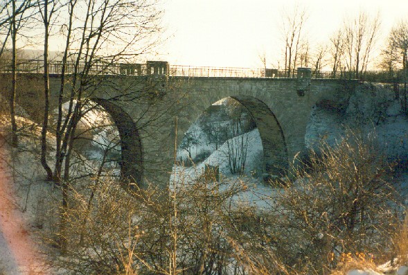 der halbkreisförmige Mittelbogen hat eine Spannweite von 21,60 m und die 2 halbkreisförmigen Endbögen haben eine Spannweite von 10 m mit verlorenen Widerlagern.