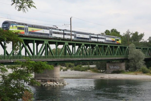 Die Brücke ist doppelstöckig, unten die Strasse, oben die Eisenbahn.