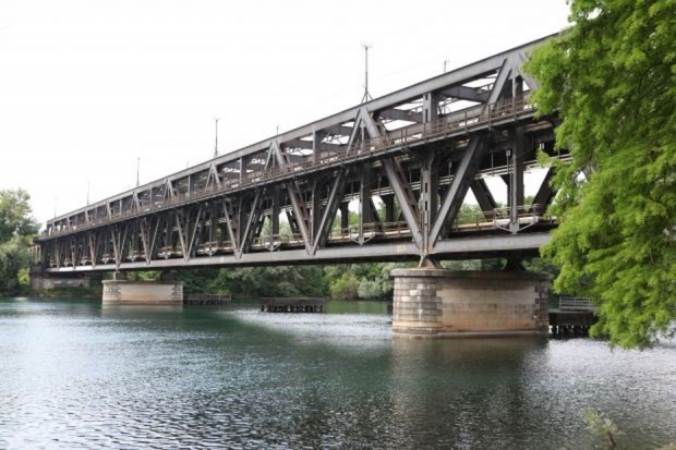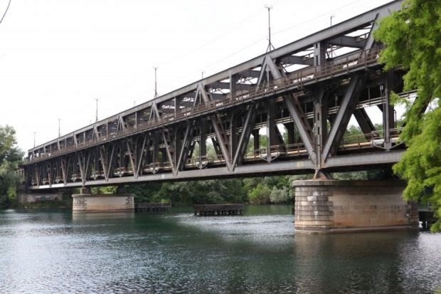 Die Brücke ist doppelstöckig, oben Strasse und Eisenbahn
