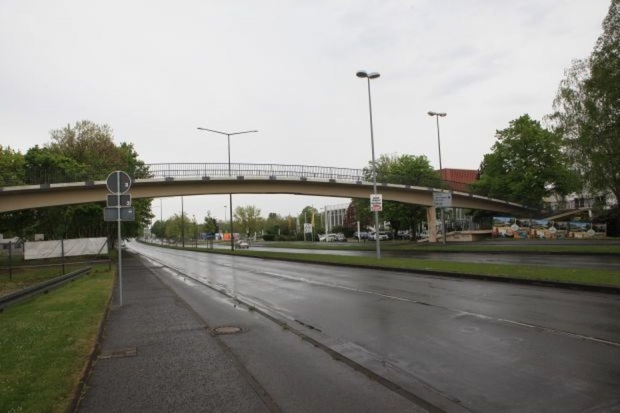 Die Brücke wurde abgerissen, weil sie marode war; da die Fußgängerbrücke eine Verbindung einer Schule zu den Sportanlagen war, über die täglich mehrmals Dutzende von Schülern die Bundesstraße B54 überqueren mussten. Als Behelfslösung wurde die Ampelanlage mit einer App-Steuerung versehen, damit die Lehrer die Ampel per Smartphone für die Schüler bis zu mehreren Minuten auf GRüN schalten können. Das freut dann die Autofahrer. Eine neue Brücke ist momentan zu teuer.