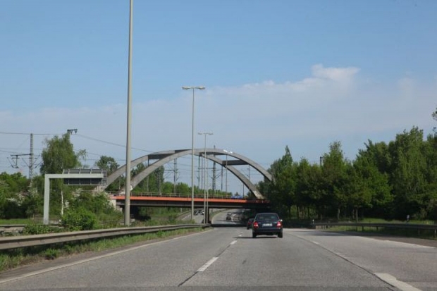 Bogenbrücke, Bogen über der Fahrbahn, Stabbogenbrücke, Balkenbrücke