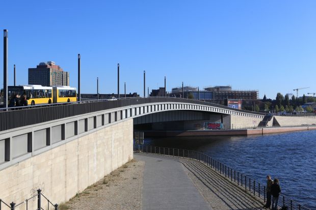 Die Hugo-Preuß-Brücke wurde zwischen 2002 und 2004 errichtet. Sie hat eine Gesamtlänge von 88,50 m und eine Gesamtbreite von 24 m. Es wurden 1.400 t Baustahl verarbeitet. Die Baukosten belaufen sich auf 7,8 Mio. €. Die Brücke mit einem Überbau aus Stahl, wurde nach einem Entwurf des Architekturbüros Professor Ungers gebaut. Sie folgt im Grundriss dem bogenförmigen Verlauf der Spree. Die Gestaltung des quadratisch kassettenförmigen Gesimsbandes, welches beidseitig über die Ufer des Berlin-Spandauer-Schifffahrtskanals hinausgeführt wird, gibt ihr ein besonders schlankes und stringentes Erscheinungsbild. Auf der Brückenoberseite wird der bogenförmige Verlauf durch Gestaltungselemente aus 20 cm breiten Stahlstreifen hervorgehoben, die einschließlich der Beleuchtungsstelen über die Brücke hinaus fortgeführt werden.