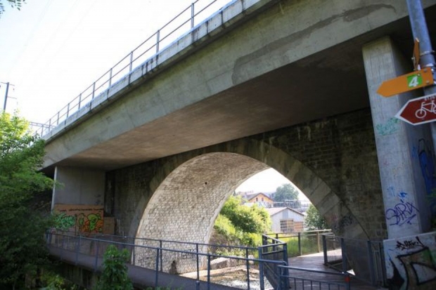 Bogenbrücke, Bogen unter der Fahrbahn, Erweiterung Balkenbrücke