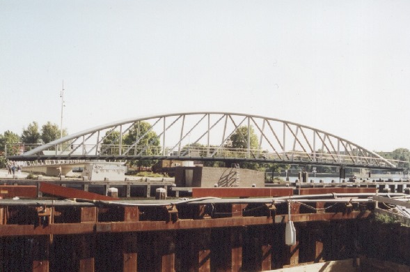 Die Brücke ist fertig, wird aber wegen den umfangreichen Bauarbeiten am Ufer noch nicht genutzt.