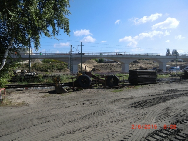 Anfang Mai 2015 sind die Segmentbrückenfelder an der westseitigen Auf- und Abfahrt im Rohbau fertiggestellt und die Stählernen Hohlkastenprofile über der Hauptstraße sind auch eingebaut. Der Zusammenschluß beider Teile über nen Gleisanlagen ist noch nicht erfolgt