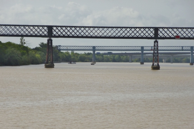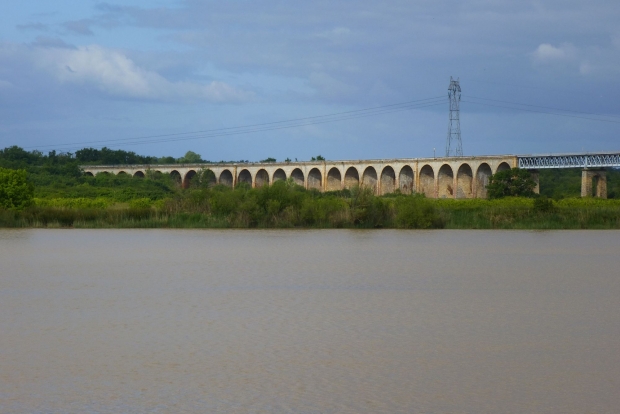 Blick auf die Eisenbahnbrücke, dahinter die Straßenbrücke von Eiffel, deren Bilder ich noch heute oder morgen senden werde. Gut sind die unterschiedlichen Pfeiler zu erkennen: bei der Eisenbahnbrücke eine Schweißkonstruktion, die Eiffel-Brücke hat gegossene Pfeiler.