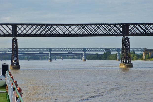 alle 4 Brücken zusammengestellt: von Norden, also der Mündung her gesehen durch die Eisenbahnbrücke hindurch die Eiffel-Brücke, dahinter die Autobahnbrücke und die im Bau befindliche TGV-Brücke
