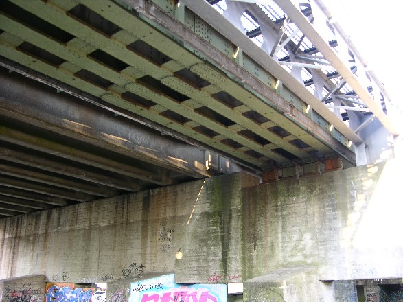 Die Autobahn hat einen Betonüberbau, das Industriebahngleis einen Stahlüberbau. auf der nördlichen Seite wurde vor dem Bau der Eisenbahn-NBS auch die Strasse über die Pfeiler geführt. Heute hat diese Strasse eine eigene Brücke (BAS 8368)