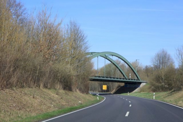 Bogenbrücke, Bogen über der Fahrbahn, Stabbogenbrücke