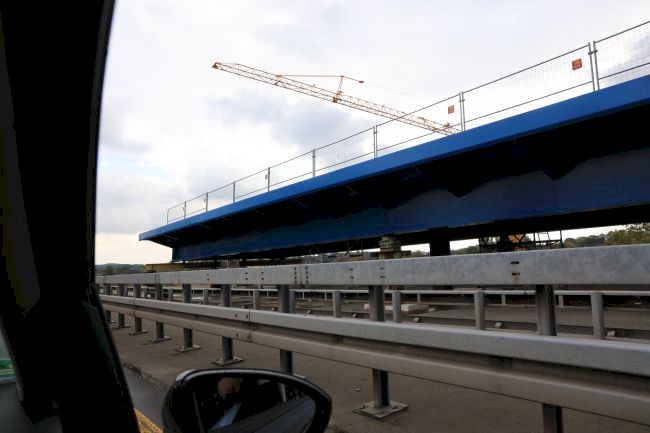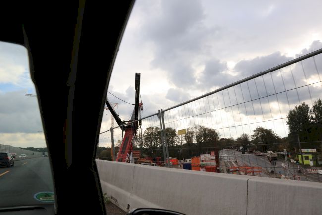 Die Träger liegen auf der Autobahn für die Montage am nächsten Wochenende