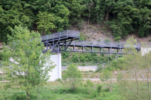 aktuell als Aussichtplattform gebaut, soll es später eine Brücke vom Lenhauser Tunnel über die Eisenbahn und Straße werden.