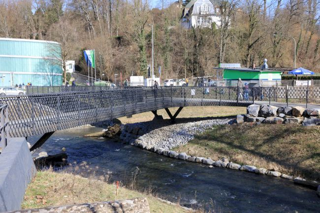 Die Brücke hat 3 Wege, die sich über der Bachmündung treffen.