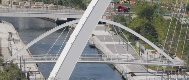Brückentyp: Bogenbrücke, Bogen unter der Fahrbahn, Fachwerkbrücke
