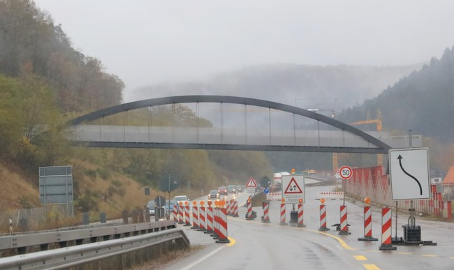 Bogenbrücke, Bogen über der Fahrbahn, Stabbogenbrücke