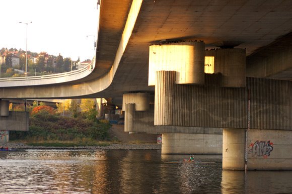 Information provided by Pavel Walsh:<br><br>Width: 40.00-50.00 m<br>A part of the bridge was put into operation in 1983. She is now hopelessly congested, inappropriate and dangerous main link of the motorways D1 and D5 by Prague. It has two distinct roads with four traffic lanes. Six fields with the spans of 34.00-61.00-71.00-72.00-66.00-45.00 m. The bridge is the largest bridge construction work in the Czech Republic. It was originally planned as a temporary measure for five years. A large, 'balance' is called on the bridge, refer to concrete sculpture by J. KLIMEŠ, Prague as "Hippo pool".