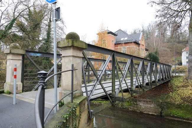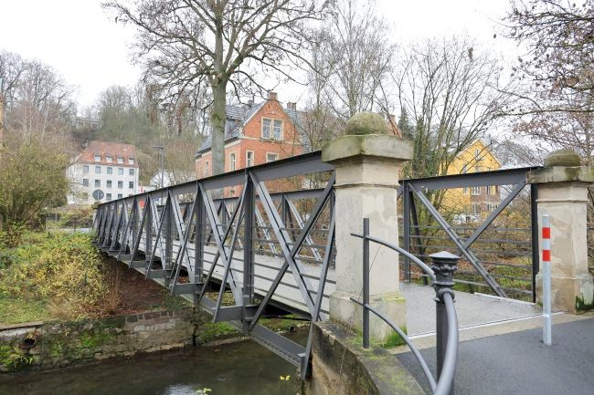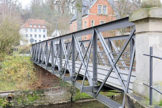 Wikipedia: The Brockardt Bridge is a pedestrian bridge made of iron trusses. The structure was built by the Stuttgart company Christian Leins for the Coburg master builder Bernhard Brockardt as a private footbridge and transferred to the city of Coburg in 1933. The trough bridge's construction features iron truss girders on both sides with riveted diagonal angle profiles and horizontal T-profiles. The bridge is 22.15 meters long and four meters wide. The passage width is 2.82 meters. The structure was renovated in 2014. The wooden plank deck was replaced with steel plates, and reinforcement measures increased the bridge's weight from 13.5 to 15 tons.