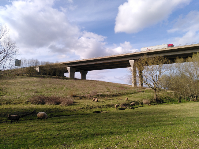 in the immediate vicinity of the evening Valley mill<br>The building is located in a left turn with R = 9000 m as well as regarding the height development in a tub with R = 27000 m at a medium-sized longitudinal gradient of 0.95% in the East. Two separate, 199 m long continuous beams with spans were built by 29 + 3 x 47 m + 29 m. It was built as special proposal in prestressed concrete instead of the official draft, which called for a two-part steel composite superstructure. T-beams was elected the two dock-side superstructure with 2,915 m cantilevered deck, so that a balanced cross section resulting in a bridge between 6.30 m. The 1.50 m wide bridges received a suit by 10 cm. The construction height is 2.30 m. The two adjacent buildings are supported by depending on a number of pillars. The octagonal in plan cross-section of pillar is designed from a rectangle with the dimensions 2 m times 5 m. In the head section of the cross section to the arrangement of the bearings is widened karitellartig to a rectangle of 3 m times 8 m. The sloping sides and the side, 1.20 m are characteristic for the pillar diameter wide and 0.35 m deep, rectangular constrictions. The bevels and cut-outs create significant light and shadows on the pillars and allow a freer perspective under the bridge at bias review. The pillar broadsides were a suit of 1:80.<br>Construction by: shaft Nordhausen GmbH, special construction by Bauer Spezialtiefbau GmbH