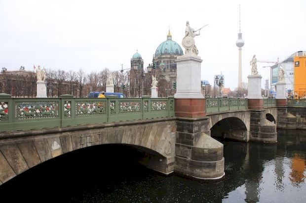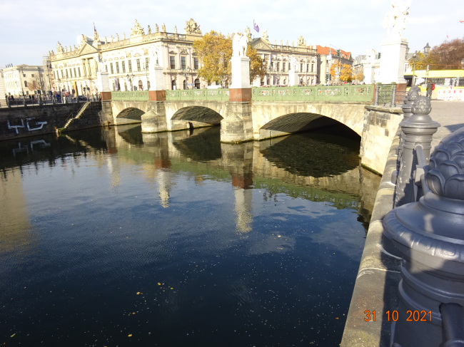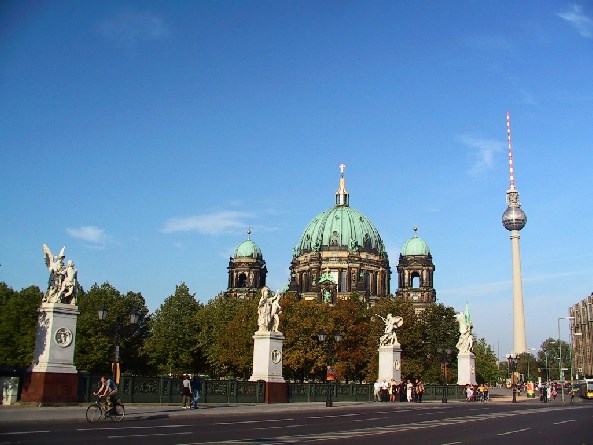 <br>Center (Alt-Berlin/Friedrichswerder), crosses the Kupfergraben (spree Canal) and connects the road the Schlossplatz under den Linden.<br><br>Created according to plans by Karl Friedrich Schinkel 1821-1824, the bridge received its name at the laying of the foundation stone on 29 5 1822. The outer of the three stone arches inserted per 11,20 m width, which was average of 7.64 m wingspan 1912 instead of 8 bridges flaps. Schinkelsche cast iron reliefs adorn the railing and the balustrades carry on both sides four granite postamente. Schinkel had earmarked as a bridge jewelry copper work, showing the life and martyrdom of a warrior. This plan could not be realised considering the empty state coffers. After a competition, the sculptures were first created and set up between 1842 and 1853. The eight white, each about 3m high figures made of Carrara marble stand on high gray marble pedestals, which are medallions with Eagle motifs.<br><br>1 Group: Nike taught the boy in history, in 1847 led by Emil Wolf (1802-1879).<br><br>2. Group: Athena taught the boys in the use of weapons, carried out in 1853 by Friedrich Anton Hermann Schievelbein (1817-1867).<br><br>3. Group: Athena armed the Warrior, 1851 carried out by Karl Heinrich MÖLLER (1802-1882).<br><br>4. Group: Nike crowned the winner, carried out in 1853 by Friedrich Drake (1805-1882).<br><br>5. Group: Nike is the wounded warrior 1853 carried out by Ludwig Wichmann.<br><br>6 Group: Athena encouraged the Warriors in the fight, 1853 carried out by Albert Wolff (1814-1892).<br><br>7 Group: The youth of Pallas anew in the fight led (Athena helps the Warriors in battle), 1854 carried out by Gustav winds.<br><br>8 Group: goddess of victory Nike contributes the fallen heroes to Mount Olympus, 1857 carried out by August Wredow (1804-1891).<br><br>in 1943, the character groups in the South port of Spandau were spent. in 1981, the Senate of Berlin within the framework of the German exchange of cultural goods handed the magistrate of Berlin the sculpture group 1983-84 after restoration is again raised at the historic site. in 1989, the base with the newly created Eagle medallions were completed.<br>The Castle bridge was called the Marx-Engels bridge 1951-1991. The bridge is listed with the allegories. (Info from www.luise-berlin.de)
