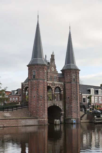 City gate on a waterway, with turrets