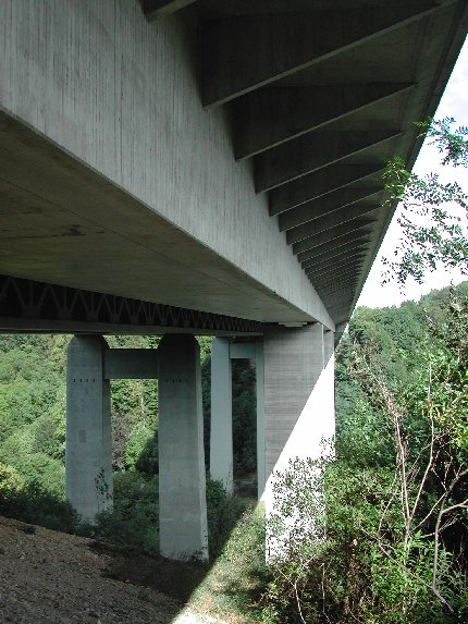 The free cantilever building built over consists of two 6.60 m high prestressed concrete trusses with a longitudinal and transverse sheet deck 23.5 m wide. A pedestrian and cycle path after kind of a double-deck bridge is located on the lower deck of the construction. The bridge spans the Mangfall Valley at an altitude of about 63 m spans from 90 + 108 + 90 = 288 m. The total cost was approximately 7.3 million DM including the construction of bicycle and sidewalk connections. A simple box girder tie-concrete beams for the extension of the motorway has been built next to the truss structure.