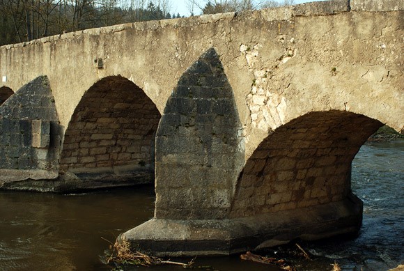 1432 first mentioned; Spans between 5.30 and 8,00 m; in the year 1800 the bridge blew the Österrreicher, 1822-1838 it was renewed in 1976 the bridge was by an American tank damaged, but repaired immediately, since 1979, it serves only to pedestrians and cyclists<br><br>Wikipedia:<br>The surviving four pilings arch bridge probably goes back to the 15th century. 1486, A bridge toll to Pfünz is mentioned, so that construction could fall during the tenure of the Eichstätter Prince-Bishop Wilhelm von Reichenau. The diocese was responsible until shortly after 1700 for the maintenance and took the toll. Then the customs collection was given to the municipality.