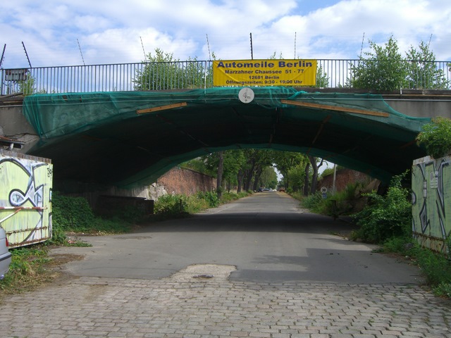 <br>The purpose of this bridge in the original sense is no longer detectable.<br><br>The lean stockyard Friedrichsfelde was built in 1903 by the cooperative for livestock exploitation in Germany GmbH. More veterinary police control of animals and thus halting the spread of disease was aspired by the concentration of cattle trade for designated and appropriate somewhere. The functions of a slaughterhouse were expressly excluded except for emergency slaughter.<br><br>The animal could be carried out with the car, there was a siding, which limited the stockyard left and right. In the northern part of the wastewater treatment plant, the veterinary medicine field, a slaughterhouse for slaughtering and the energy supply were. Through a track curve, this area was separated from the rest of the stockyard and formed a kind of diseases barrier. At peak times 24,000 horses, 104,000 cattle, 6,800 calves, 25,000 sheep, 240,000 pigs and up to 600,000 pieces were counted on the lean cattle yard poultry per year.<br><br>At the beginning of the first world war in 1914, the lean cattle yard first experienced an economic boom, since he represented an ideal hub for the army and people care. After the first world war it came to 1921 to a sensitive decrease of cattle buoyancy. Parts of the grounds were rented artfremd. In the second world war was also the armed forces, in particular the German air force, a major tenant.<br><br>After the war, the area was seized by the Red Army and used as a warehouse, so the stockyard operation had to be halted. For the detainees of the uprising of June 17, 1953, a rendezvous was established here.<br><br>With establishment of the NVA, these took over the site. It was still used as a warehouse and repair base. The military parade to the birthday of the GDR was prepared on this site.