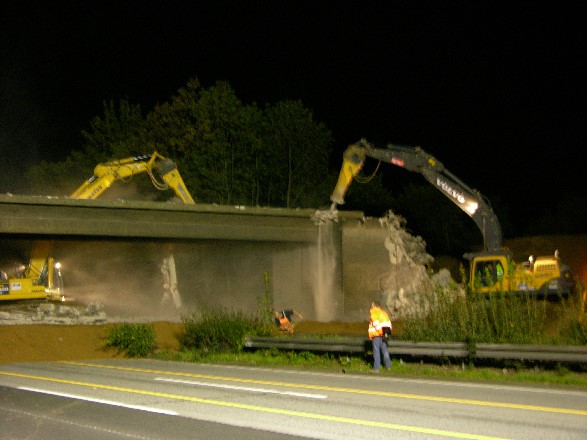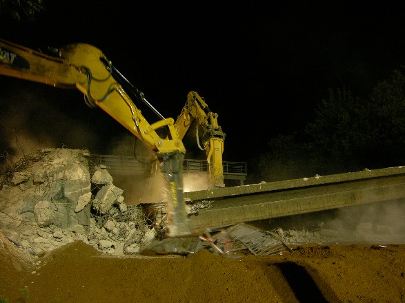 The bridge was demolished on the night of the 07.09.2007 on the Kaka.<br>23:45: The motorway is blocked with 1 3/4 hour delay and immediately begin the work for the protective layer of the gravel under the bridge.<br>23:57: First press work begin on the Eastern abutment on the northern wall of the wing. Under the bridge, the barriers are removed.<br>0: 15 Am: The press work begin on the Western abutment.<br>12: 35 Am: The barriers are gone and the remaining gravel can be distributed.<br>1:30: The gravel bed is finished and the demolition work at superstructure begin. First is the southern balustrade by the excavators (Komatsu) torn down, and then the southern cantilever from ripped during the CAT excavator through the abutment to the superstructure of durchkabbert.<br>2 H 50: Falls the bridge superstructure.<br><br>Machinery: There were 4 crawler excavator in use, which had built Stemmmeißel, blades or pliers as needed:<ul class="listeklein"><li>a CAT 345</li><li>a Kamatzu PC 450</li><li>a Volvo EC 240</li><li>a Volvo EC 360</li><li>In addition a wheel loader Liebherr 564</li></ul>All excavators were of the company Moß from Lingen.<br><bR>After piers and abutments were built, the 4 prestressed concrete main carrier with a were levied in the night of December 21, 2007 on the December 22, 2007 crane 500 t truck of company Breuer &amp; Wasel. The two Western winners were fitted first, then moved the crane, and then built the two Eastern carrier. The installation takes but 4 hours longer than originally planned, so that the highway could only be reopened against 12:00
